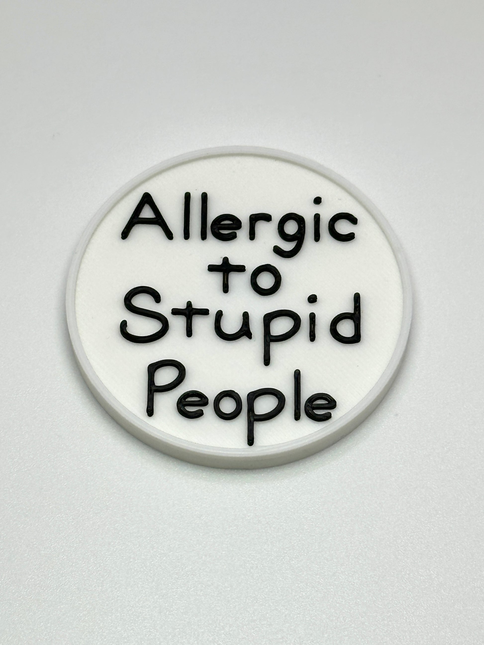 This magnet features a crisp white circle base, providing a clean, striking background for the message. The entire phrase, "Allergic to Stupid People," is meticulously 3D printed in bold black letters, creating high contrast that ensures the statement stands out clearly. It's the perfect blend of simple, classic design and blunt, relatable humor.