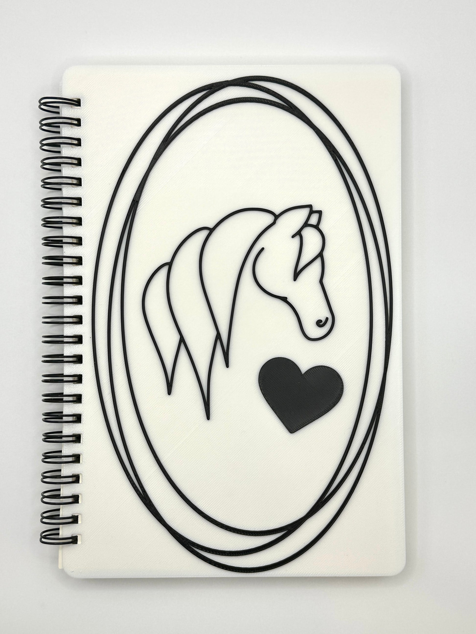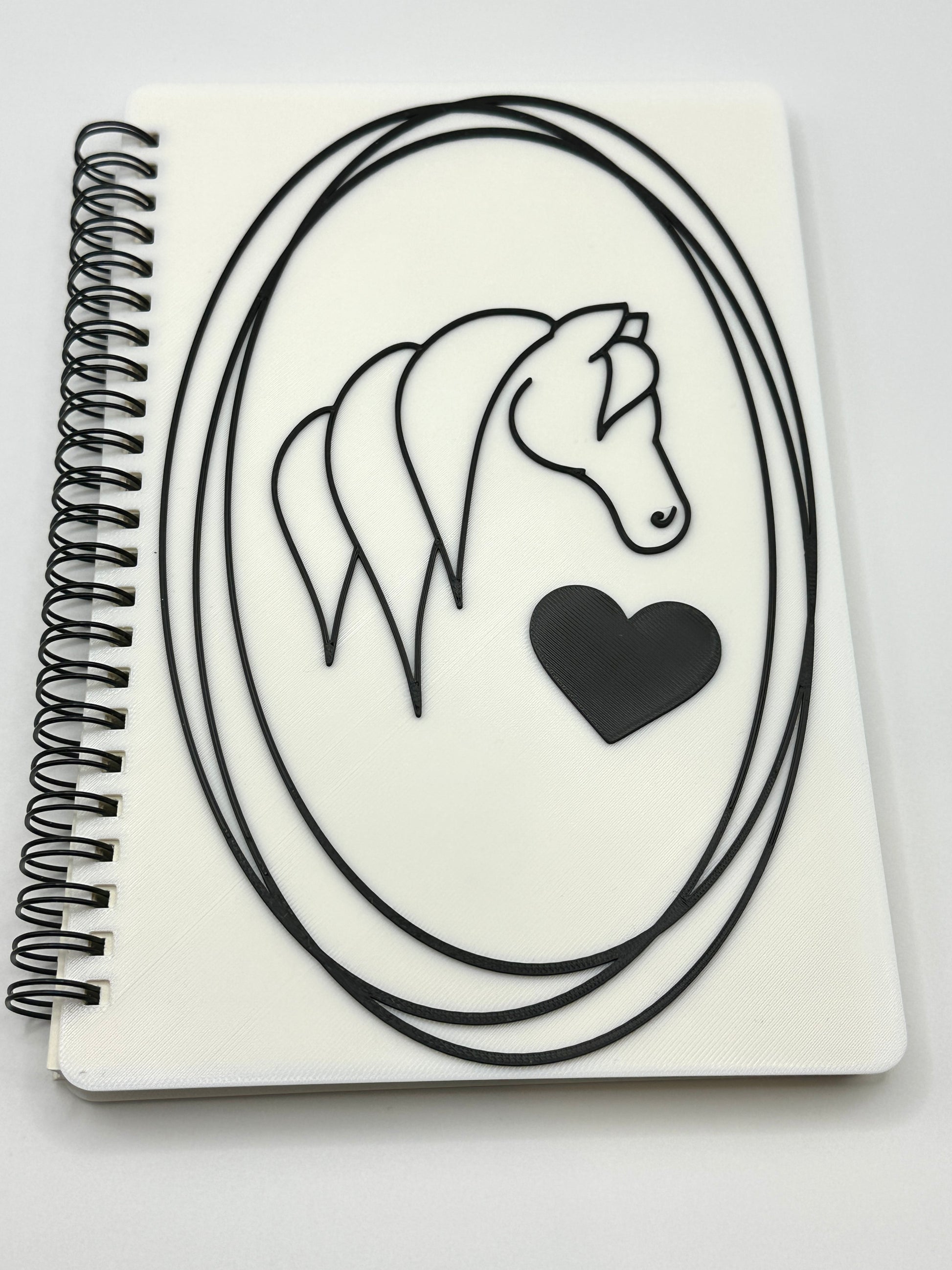 This unique notebook features a white cover, providing the perfect canvas for a striking, high-contrast design. The image showcases a beautiful horse's head in a portrait style, perfectly balanced next to a bold, prominent heart. The entire illustration creates a powerful image that symbolizes loyalty and affection. This design is both simple and deeply expressive, inviting you to fill its pages with your own cherished thoughts.
