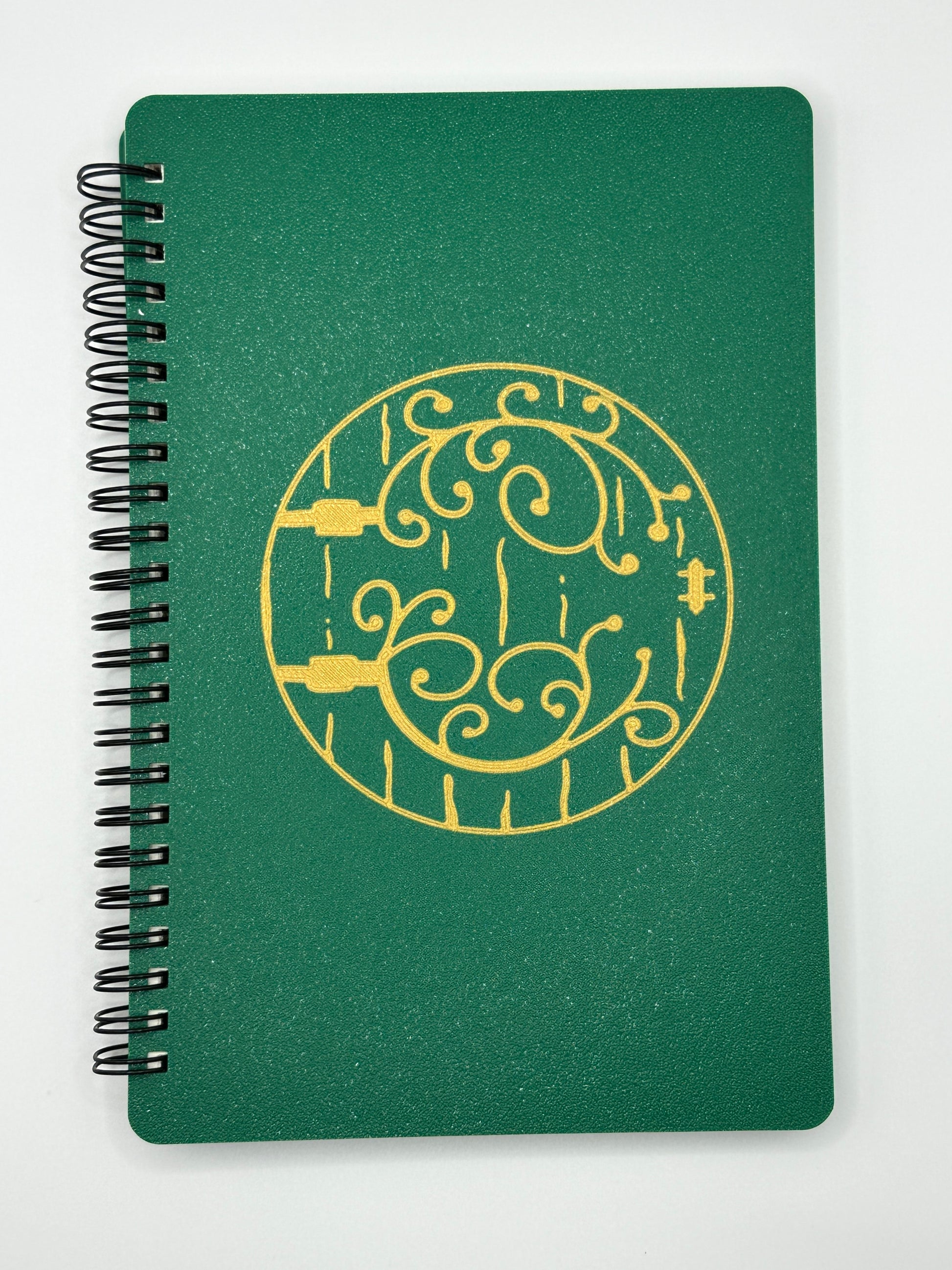 This unique notebook features a rich, dark green cover, meticulously 3D printed with a captivating design of a mystical round doorway. The intricate details of wood grain and the beautiful metal embellishments are brought to life in a shimmering gold, creating a striking contrast that feels truly enchanting. Itβs a perfect blend of subtle elegance and whimsical charm, inviting you to discover the stories waiting within its pages.
