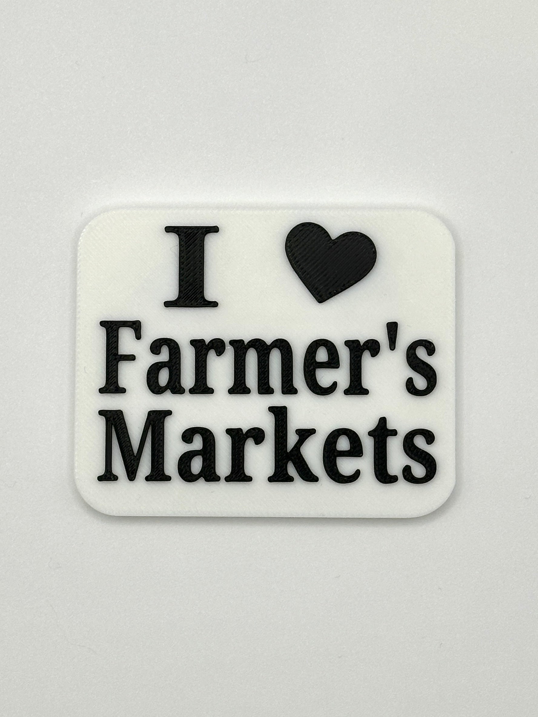 This magnet features the classic, beloved phrase "I ❤️ Farmer's Markets," rendered in a clean, legible typeface with the heart symbol standing out boldly. The design is meticulously 3D printed in high-contrast black on a white base, ensuring the statement is sharp, clear, and visible. This piece of functional art is a charming addition to any kitchen or magnetic space.