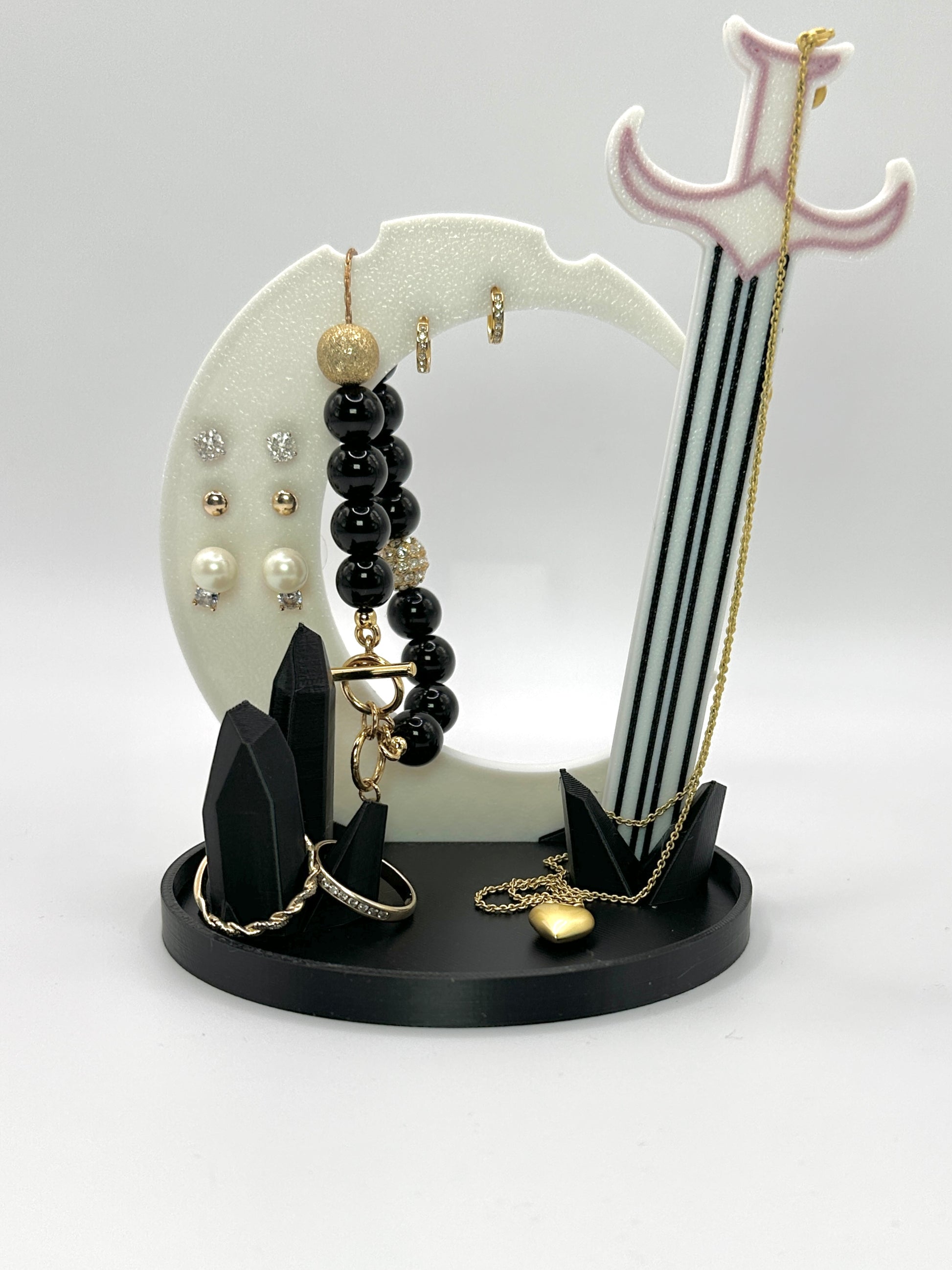 The sturdy base grounds this magical piece with three striking 3D-printed "crystals," forming a secure haven for your rings and additional small treasures. Rising dramatically from the base, a distinctive 3D-printed sword provides an additional, stunning element, ready to cradle even more necklaces or bracelets with a touch of fantasy.