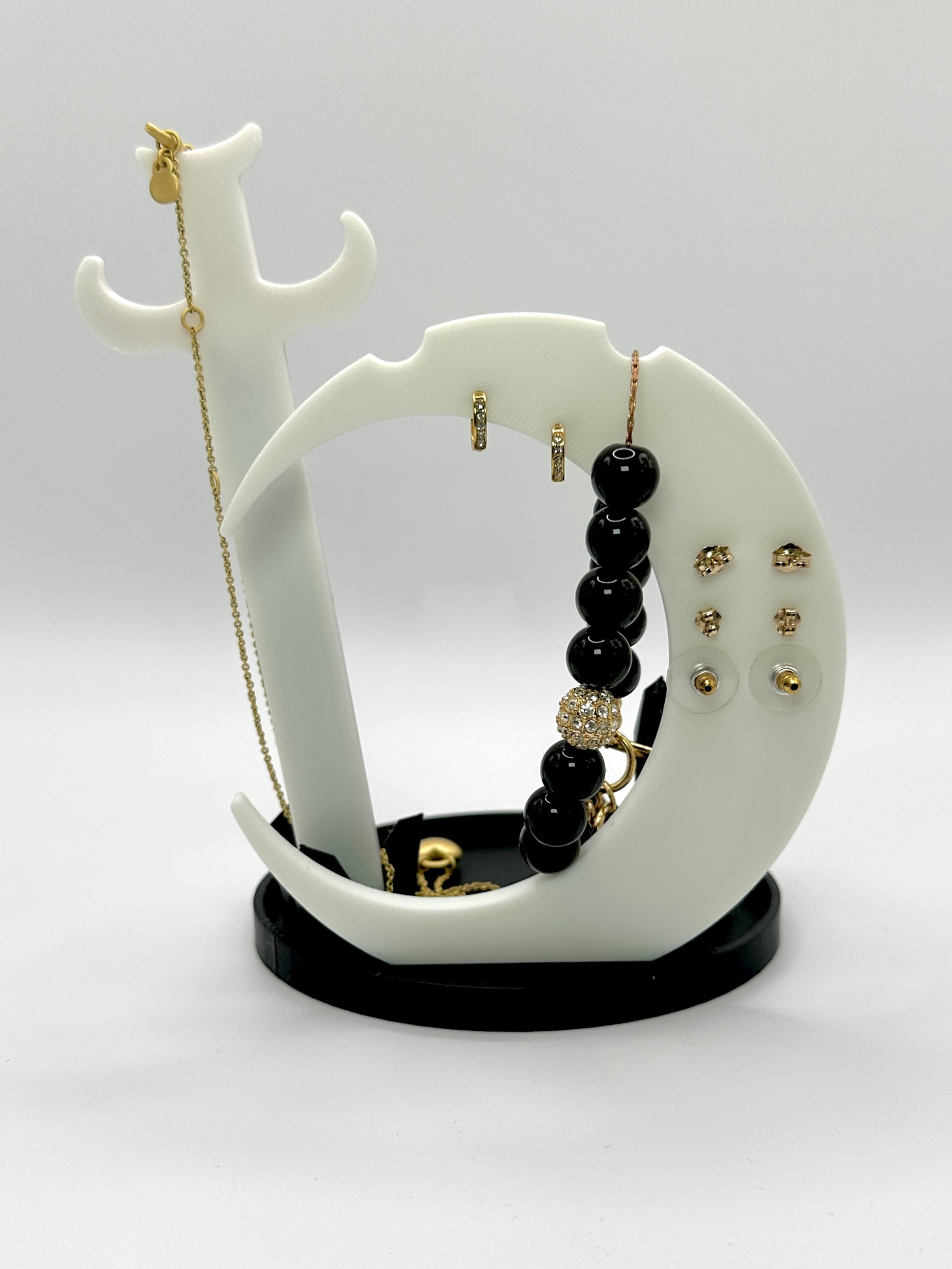 A Realm of Organized Enchantment: At its heart, a pristine white crescent moon is beautifully designed with three dedicated spots for your stud earrings, and features a special space to elegantly hold a set of dangle earrings. Thoughtfully integrated into the moon's upper curves are two elegant cut-outs, perfect for gracefully draping necklaces or bracelets, keeping them untangled and luminous.