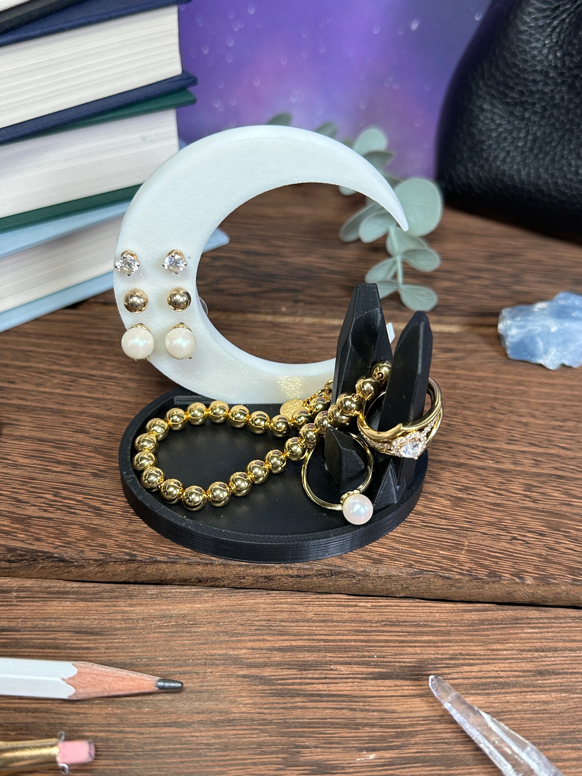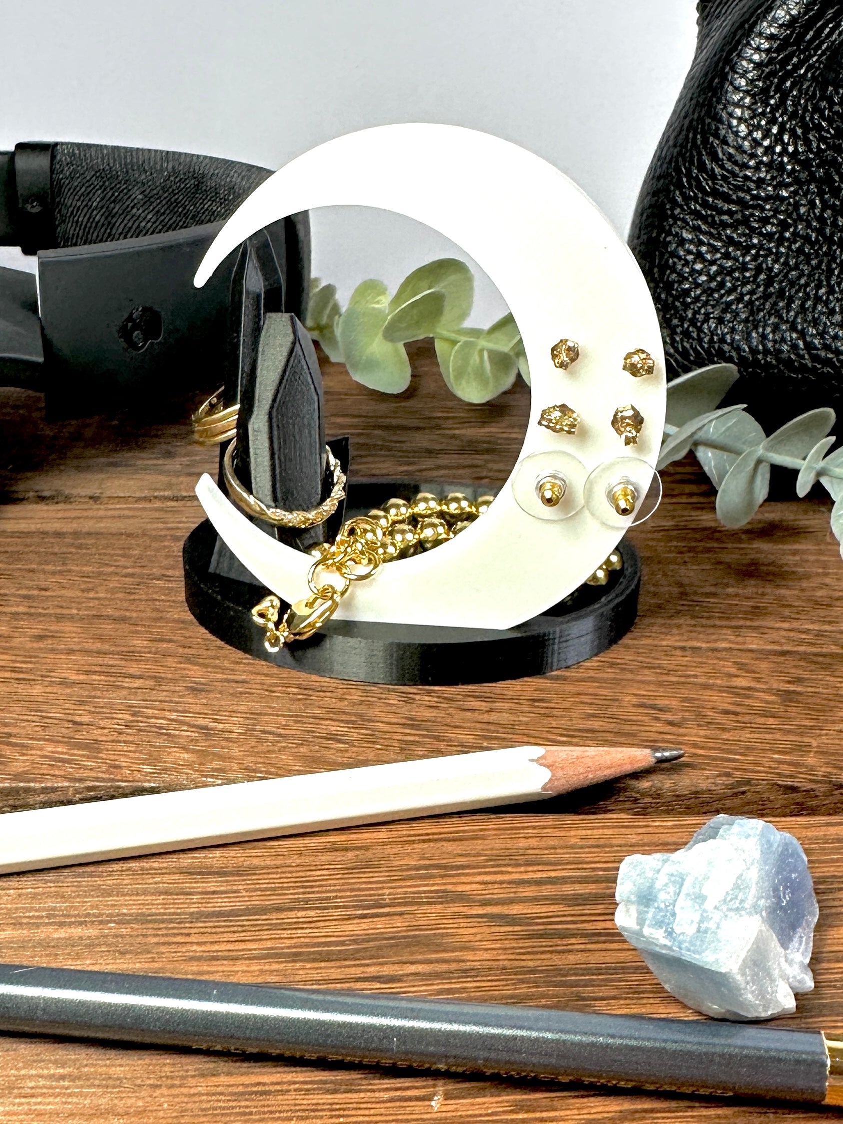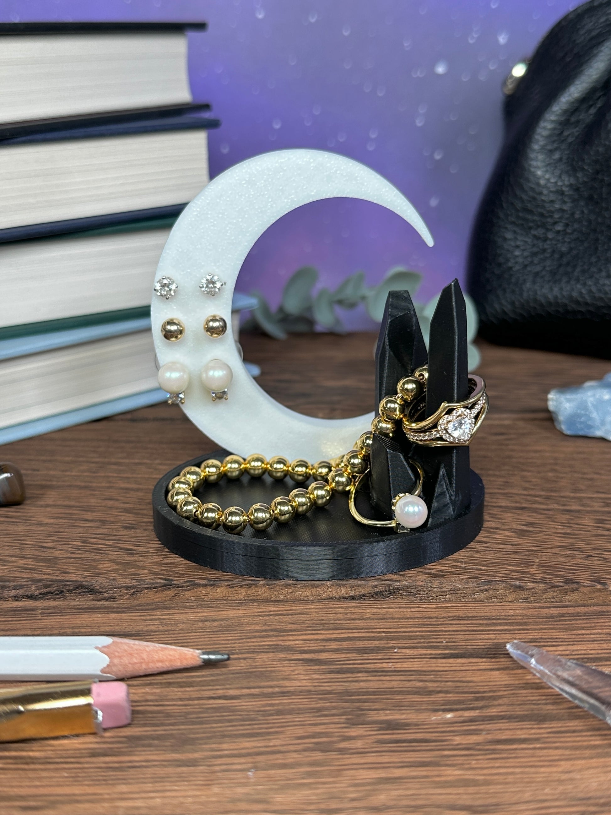 Compact Charm, Thoughtful Organization: Measuring a delicate 84mm tall and 80mm wide, this holder offers a delightful way to keep the pieces you love and wear most beautifully organized. A pristine white crescent moon rises gracefully, providing three delicate perches specifically designed for your favorite stud earrings, ensuring they're always in sight and never lost. The sturdy base is thoughtfully crafted with three 3D-printed "crystals" to securely cradle your rings, while also offering a safe haven for other small treasures like hair ties or tiny trinkets.