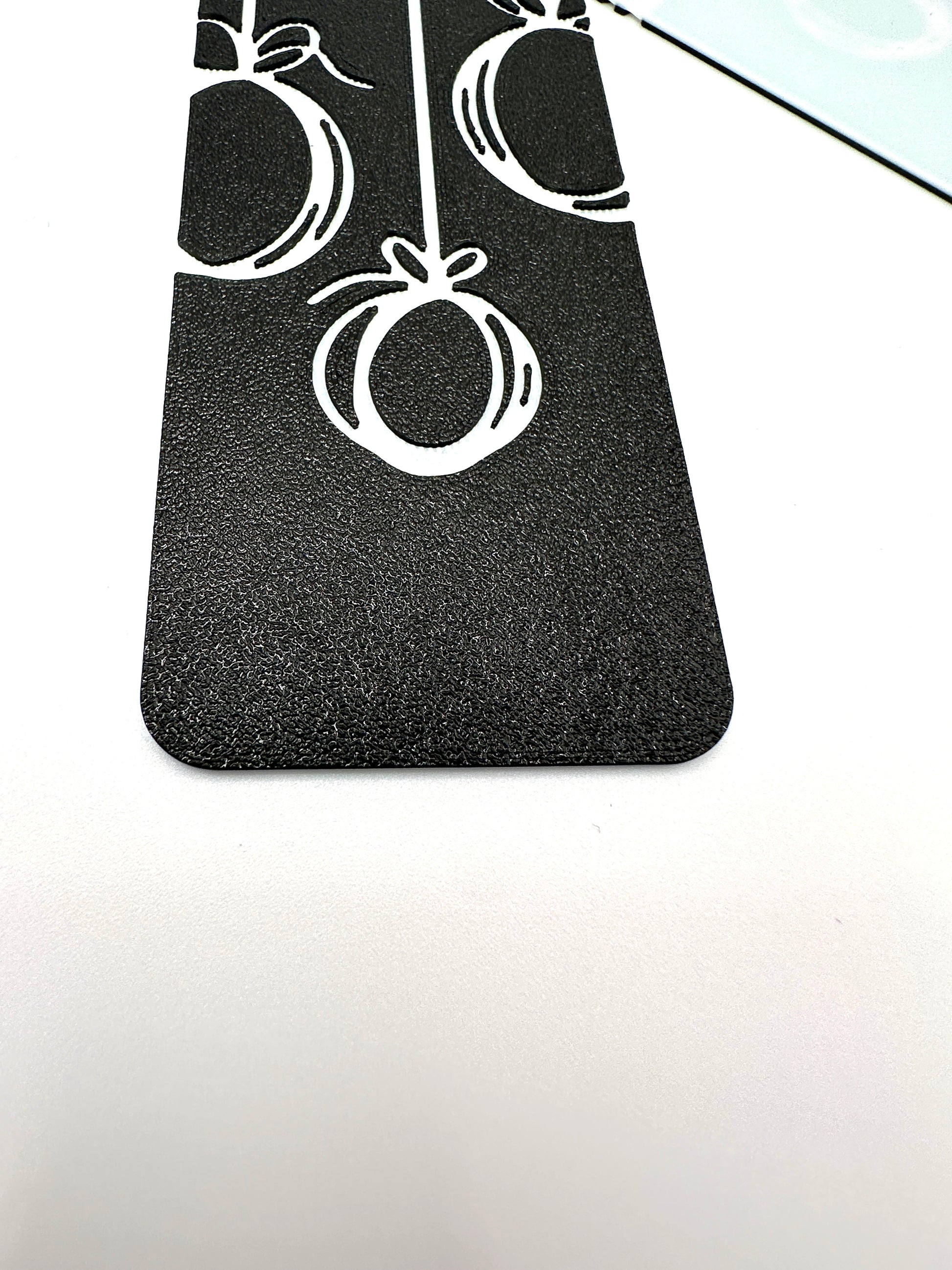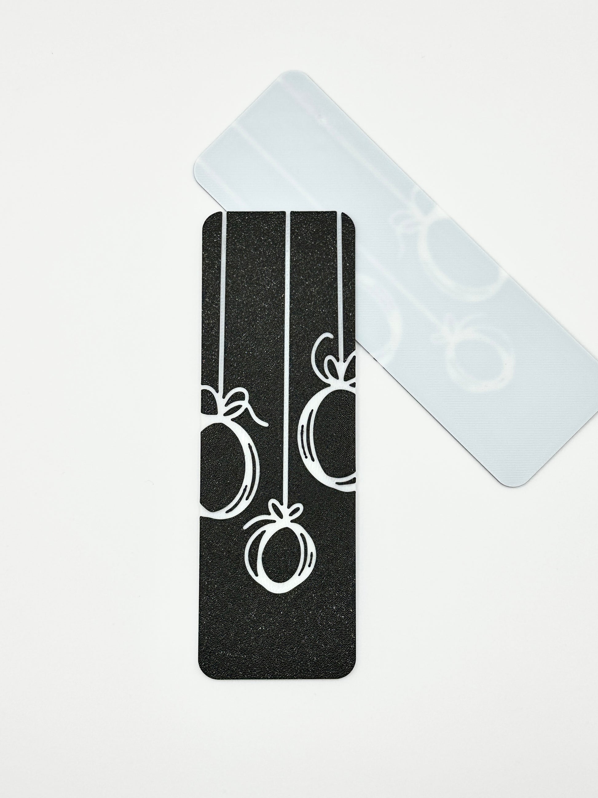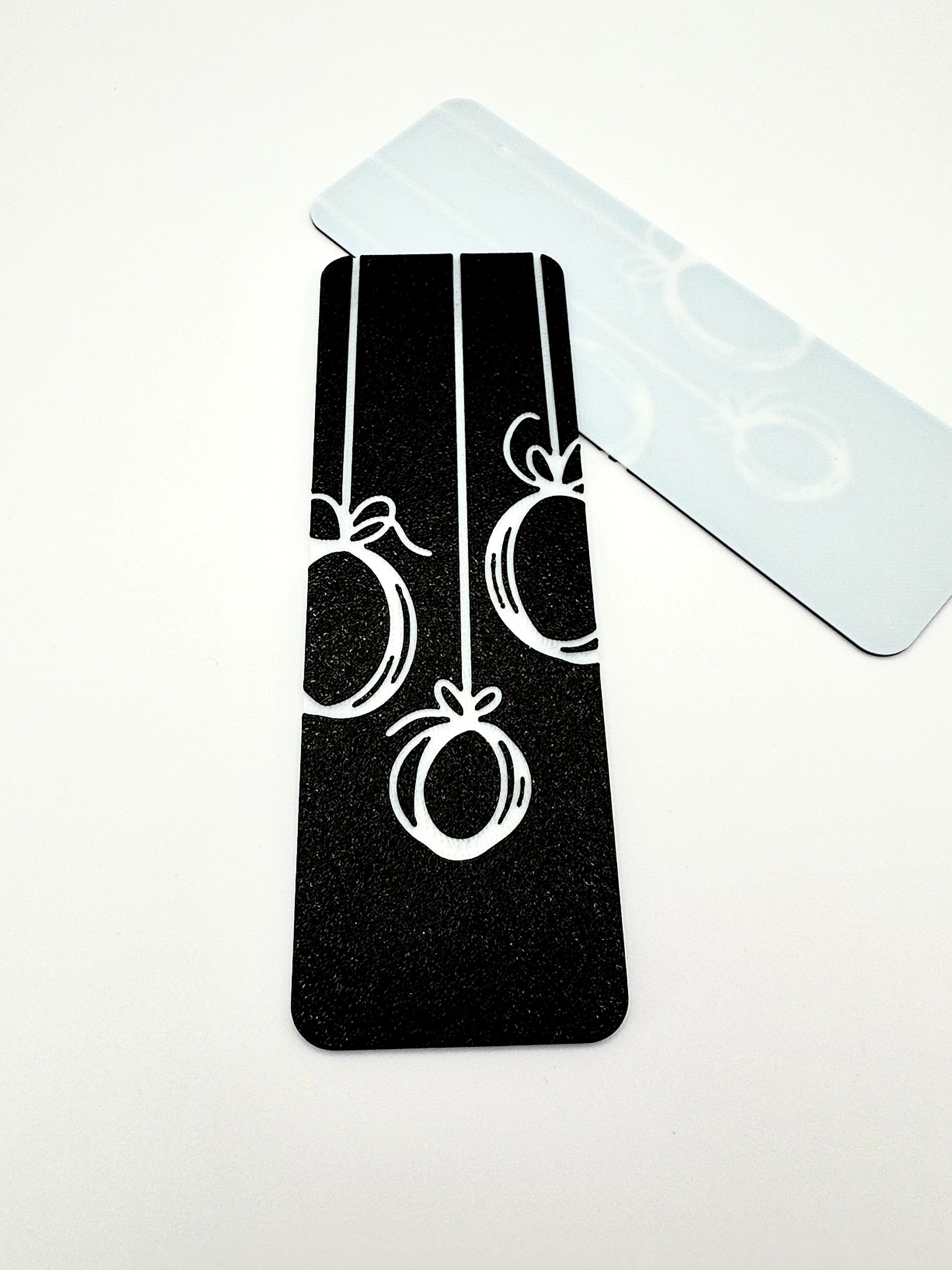 Inspired by the delicate dance of winter's embrace, this unique bookmark features the captivating outlines of three classic ornaments. The top of the bookmark is a striking black, creating a beautiful contrast that makes the crisp white outlines of the ornaments truly pop. It’s a perfect blend of elegant simplicity and festive wonder, creating a resilient page marker that's as enchanting as a winter's night!