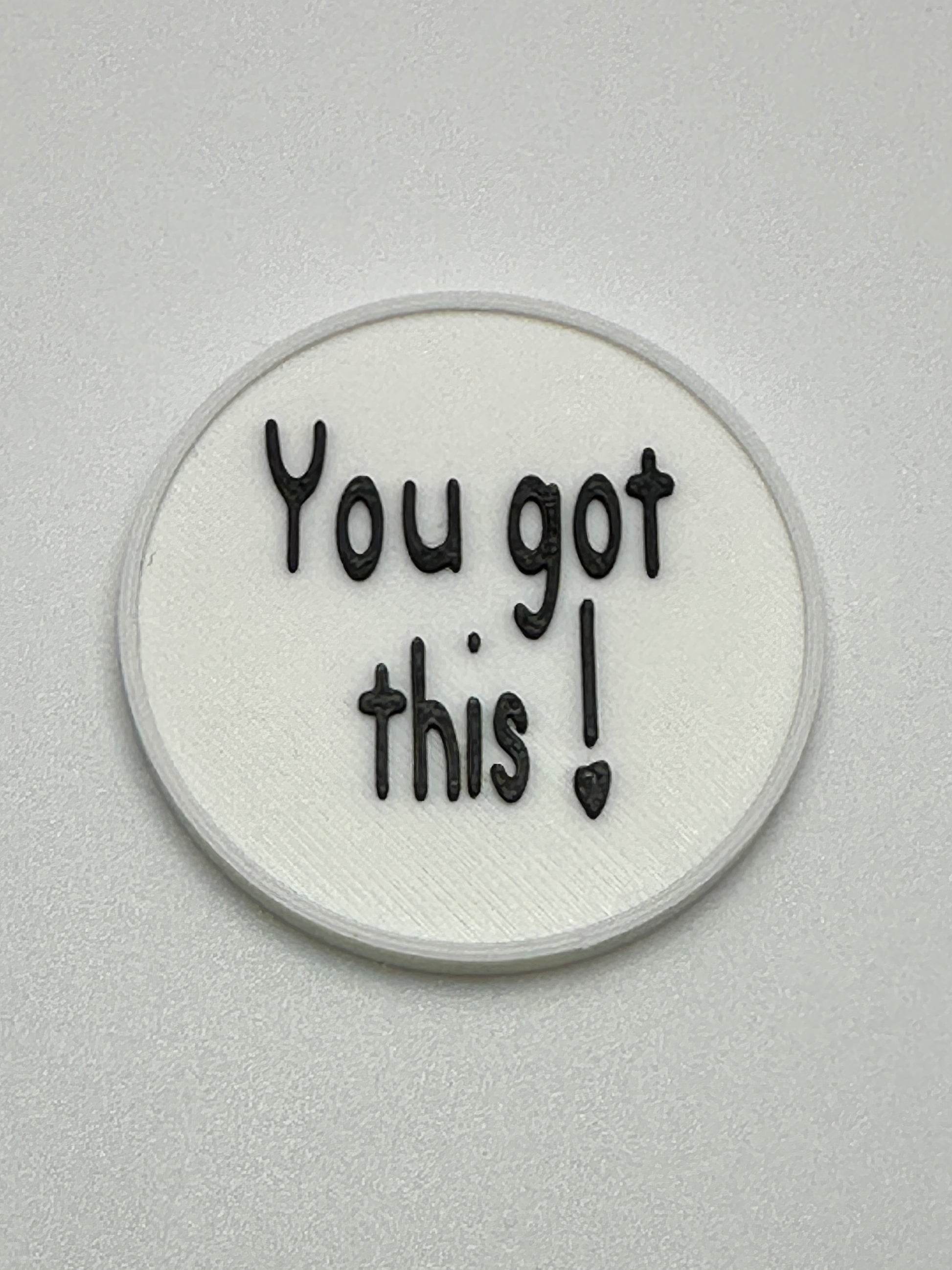 This magnet features a crisp white circle base, providing a clean canvas for the ultimate positive message. The phrase, "You Got This!," is precisely 3D printed in bold black letters, creating high contrast that ensures the encouragement is always clear. It's the perfect blend of simple, classic design and powerful, uplifting support.